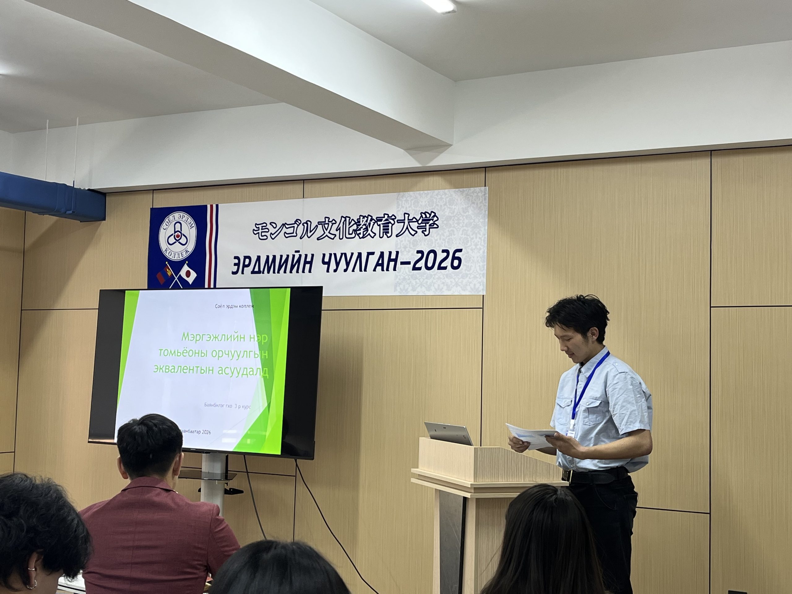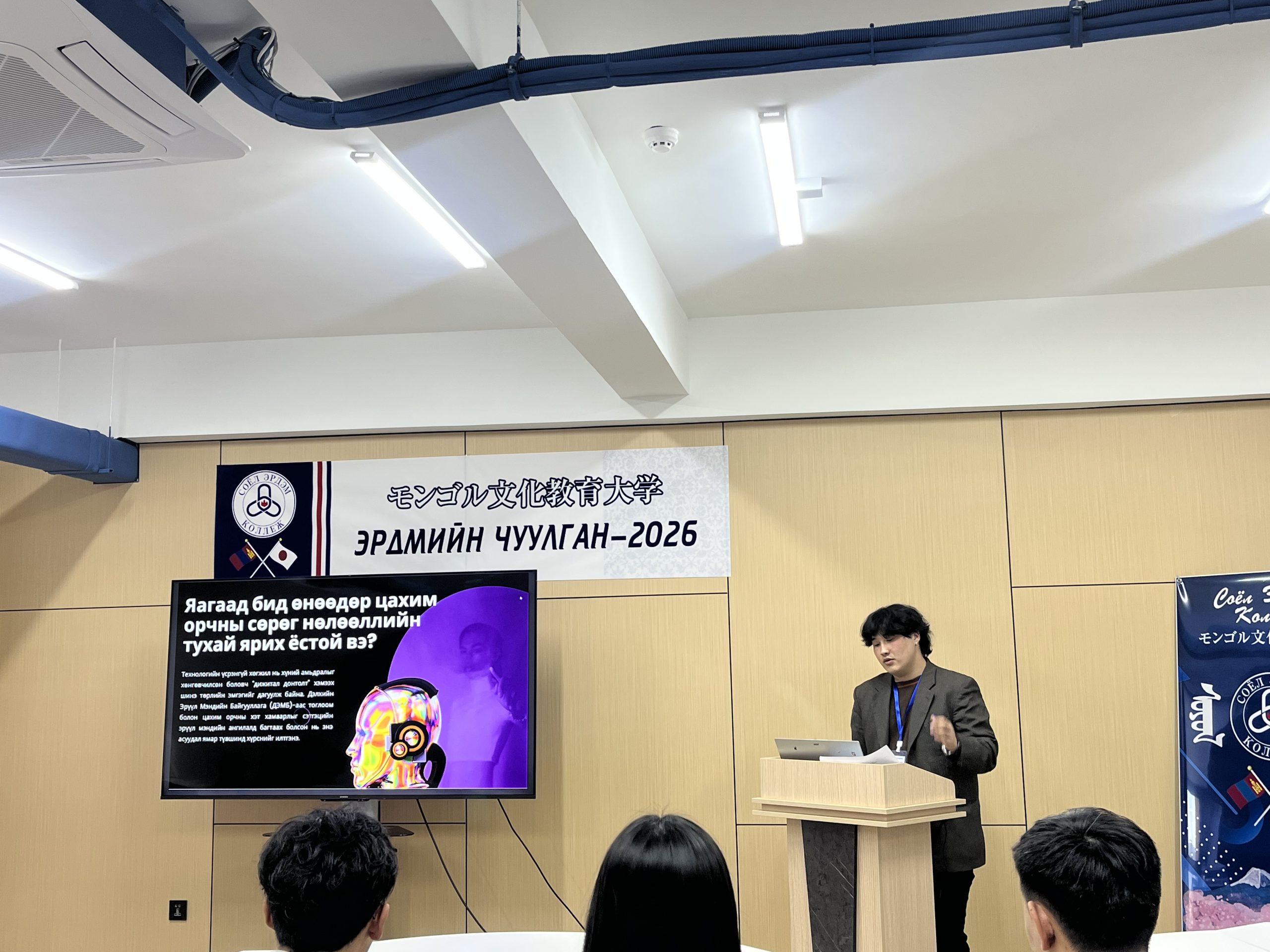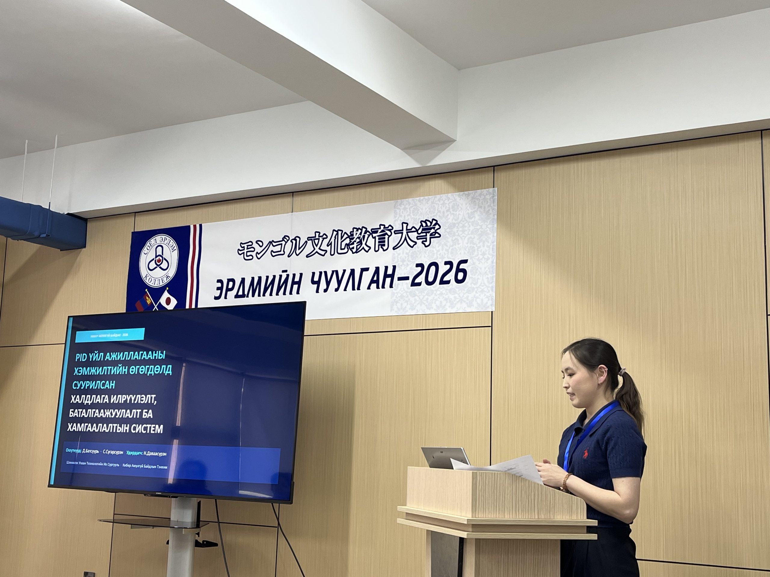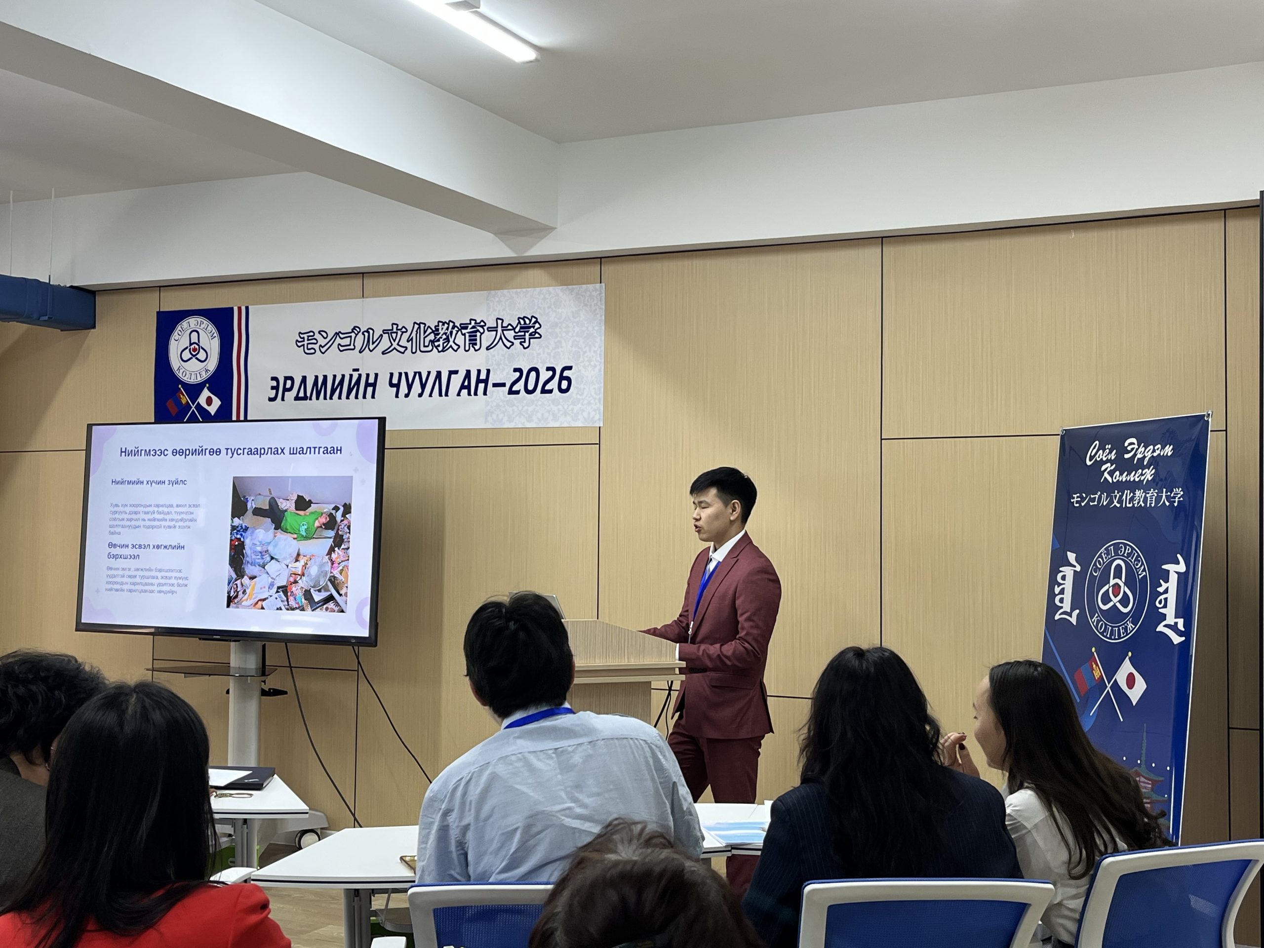 ЭРДМИЙН ЧУУЛГАН-2026-Оюутны эрдэм шинжилгээний бага хурал нь үндсэн хоёр салбараар хуралдсан ба I салбар нь “Гадаад хэл шинжлэл, Хүмүүнлэгийн ухаан” байв. Энэ салбарт СЭДС- ийн Гадаад хэлний орчуулагчийн 3-р курсийн оюутан Д.Нармандах “Япон хэл дэх өнгөний илэрхийллийн онцлог” (Удирдсан багш, СЭДС, докторант М.Мөнхцэцэг), Б.Баянбилэг “Япон-Монгол хэлний мэргэжлийн орчуулга дахь нэр томьёоны эквивалентын асуудалд” (Удирдсан багш СЭДС, доктор, профессор Ц.Пүрэвсүрэн), Л.Анхтуяа “Акихабара дүүрэг хот болох нь” (Удирдсан багш, СЭДС, докторант М.Мөнхцэцэг), Программ хангамжийн 2-р курсийн оюутан М.Мөнххүслэн “Нийгмээс хөндийрөх үзэгдлийн тухайд” (Удирдсан багш, СЭДС, докторант М.Мөнхцэцэг), Аялал жуулчлалын 1-р курсийн оюутан Ц.Нандин-Эрдэнэ, Э.Хувьтөгөлдөр нар “Аялал жуулчлалыг төвийн бүсэд хөгжүүлэх боломж: Дархан хотын жишээн дээр” (Удирдсан багш доктор, профессор Н.Галиймаа) зэрэг сонирхолтой илтгэл хэлэлцүүллээ.