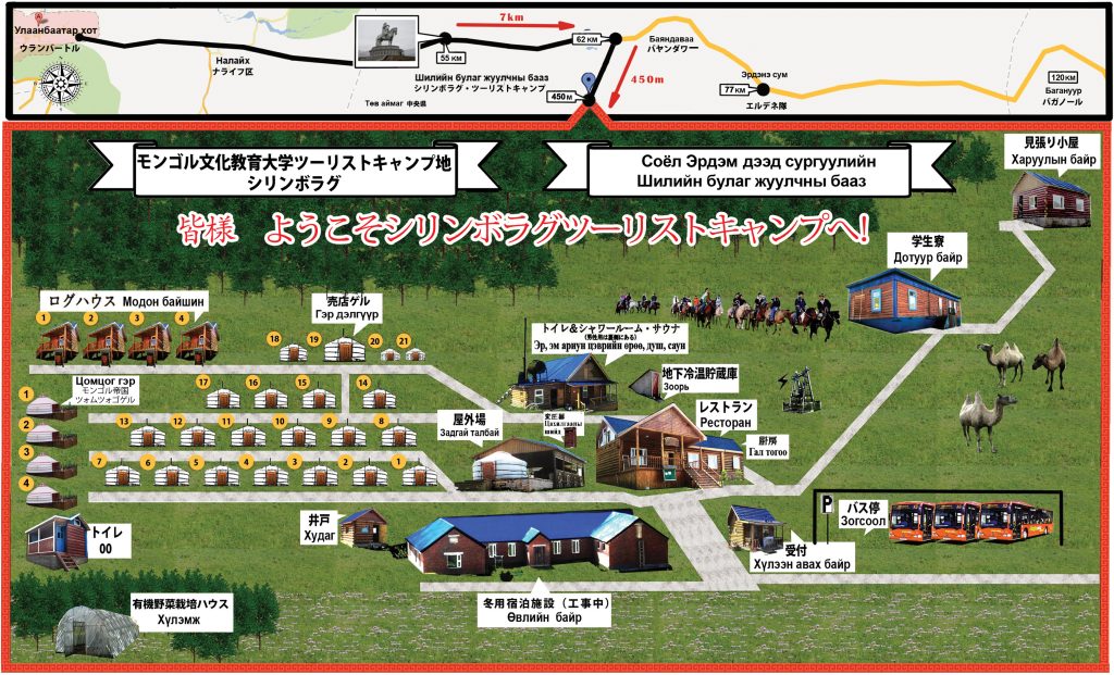 このキャンプ地は、ウランバートル市から東へ約63km、日本のODA支援で整備された道路沿いにあり、野生の美しい花々が咲き誇る森に囲まれた理想的な環境に位置します。